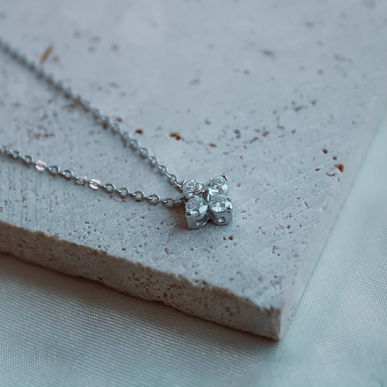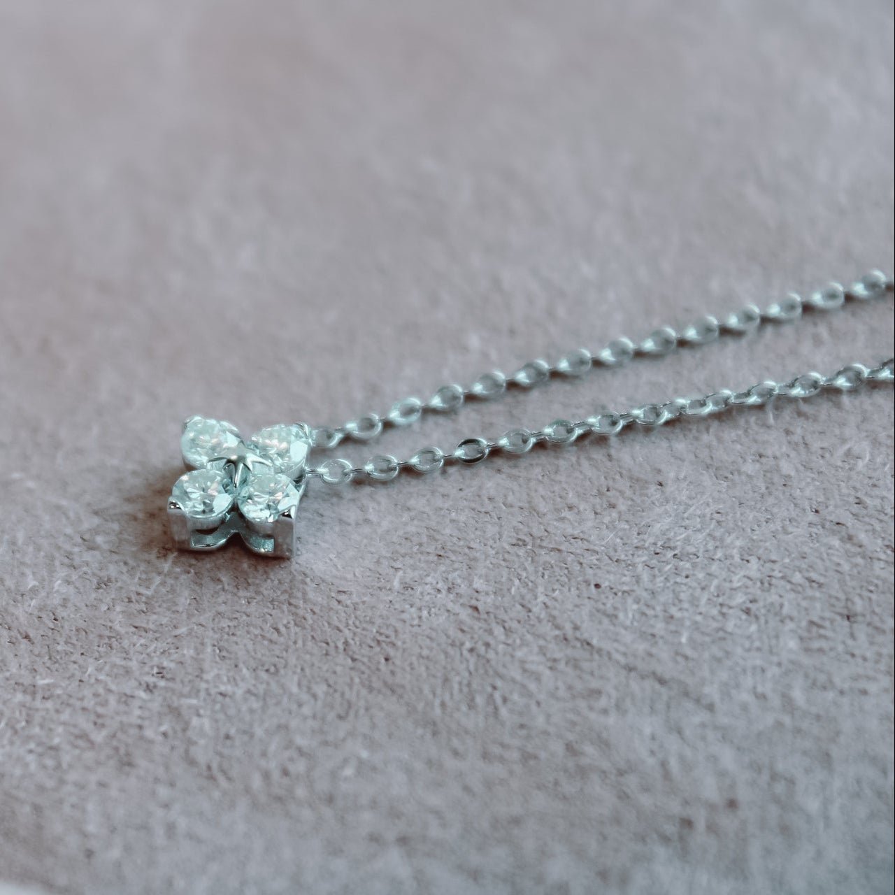 Un amuleto de fortuna y brillo. Diseñado en plata de ley 925, este collar presenta un trébol formado por 4 moissanitas de 3 mm, que en conjunto suman 0,4 ct.