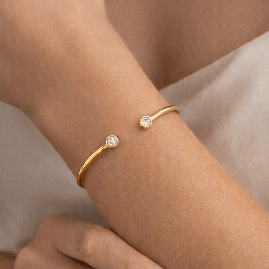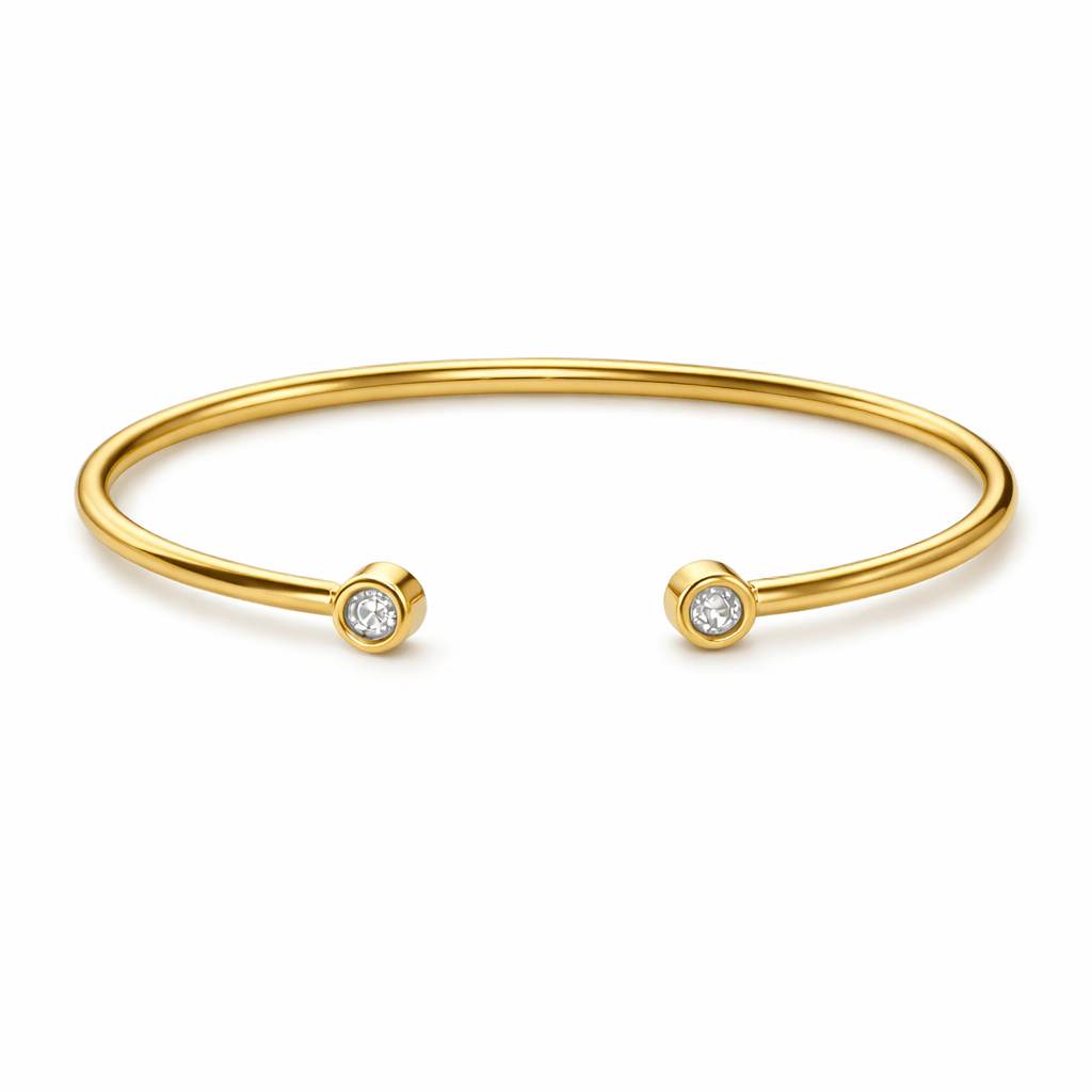 Elegancia y simplicidad en una pieza atemporal. Esta delicada esclava, de diseño minimalista, está elaborada en acero inoxidable con un fino enchape en oro 18k y detalles de circones, agregando un toque sutil de sofisticación a tu look.