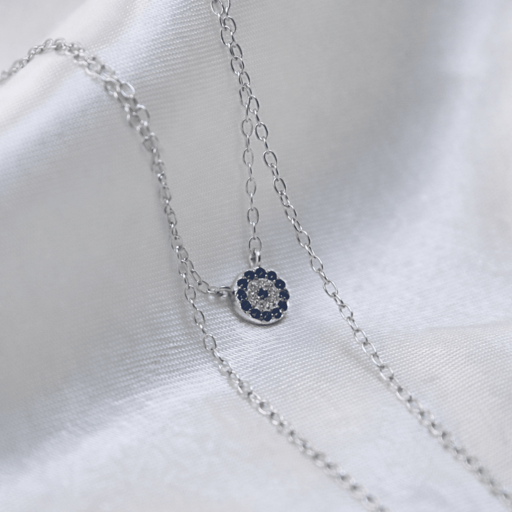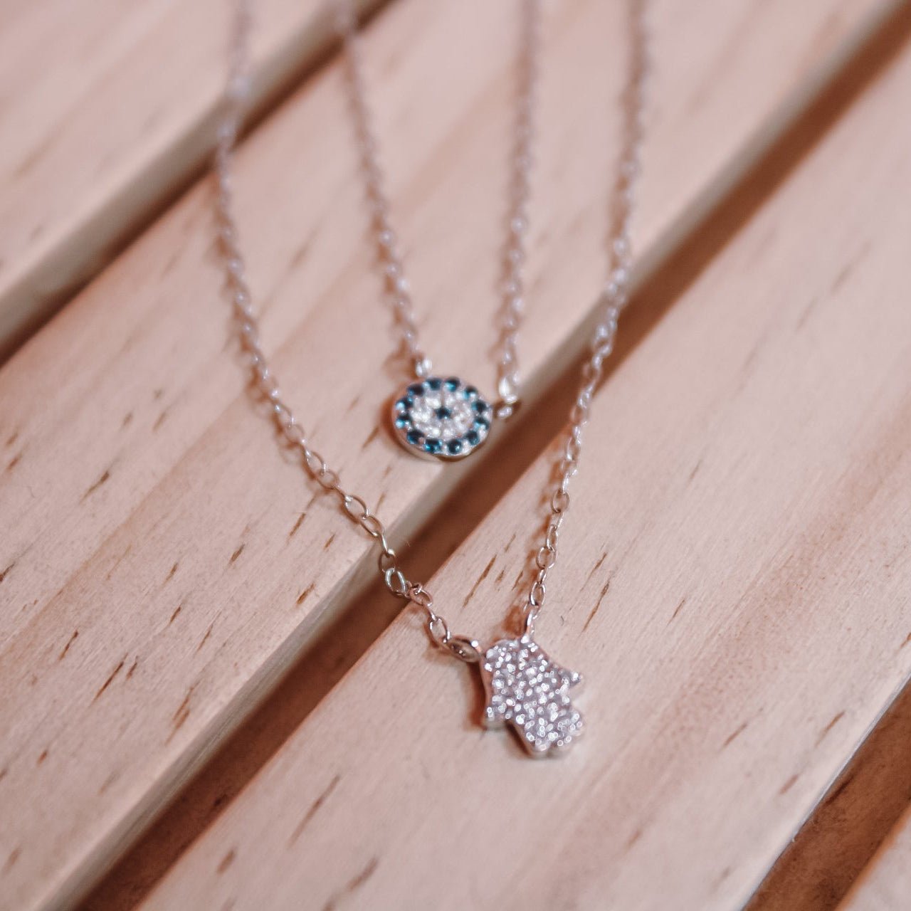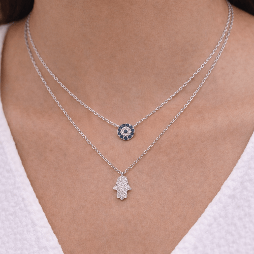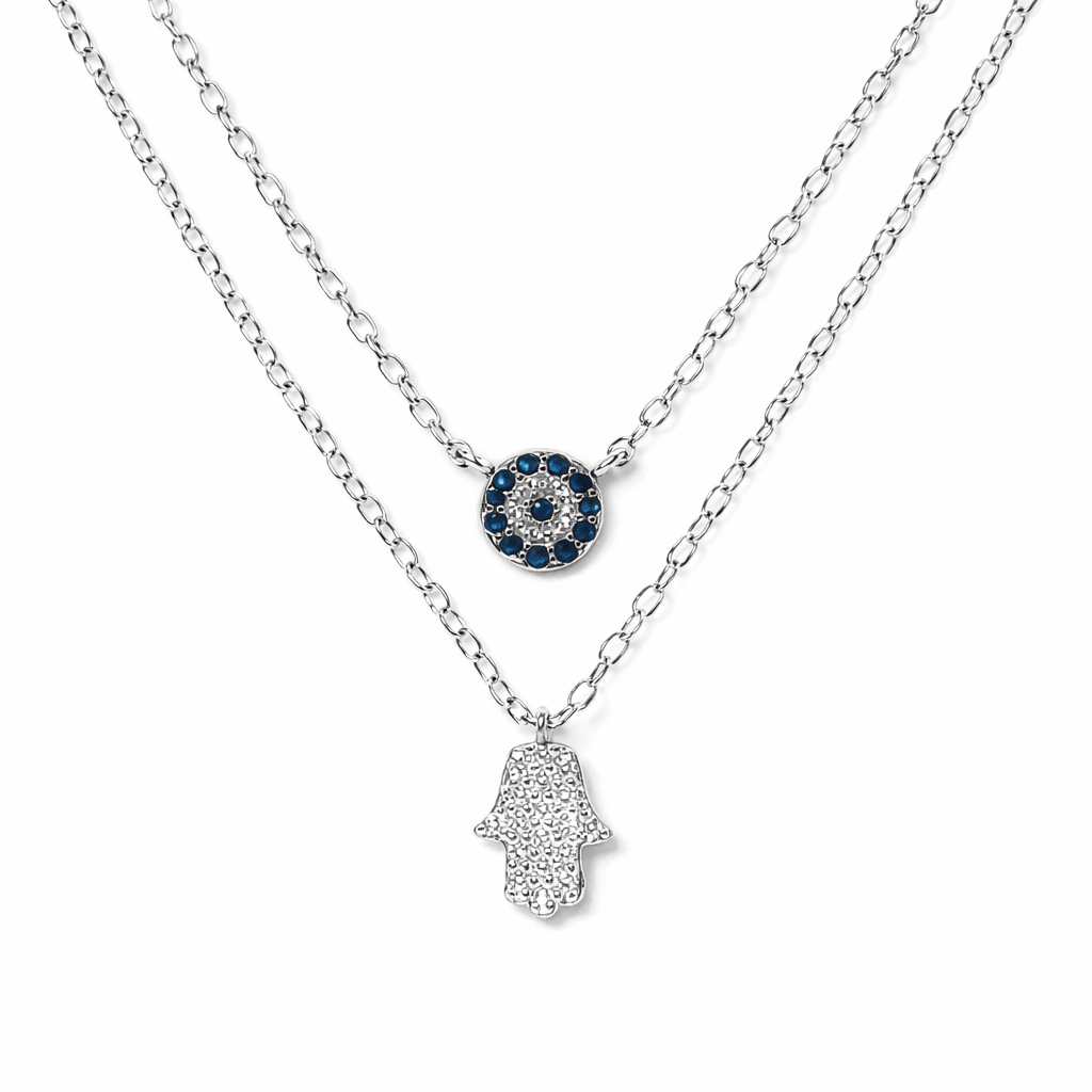 Un collar de plata de ley 925 que une dos amuletos de protección: el ojo turco con circones azules y la Hamsa engastada con circones, símbolos de equilibrio y buena energía. Su diseño en capas aporta un toque delicado y significativo para acompañarte a diario.