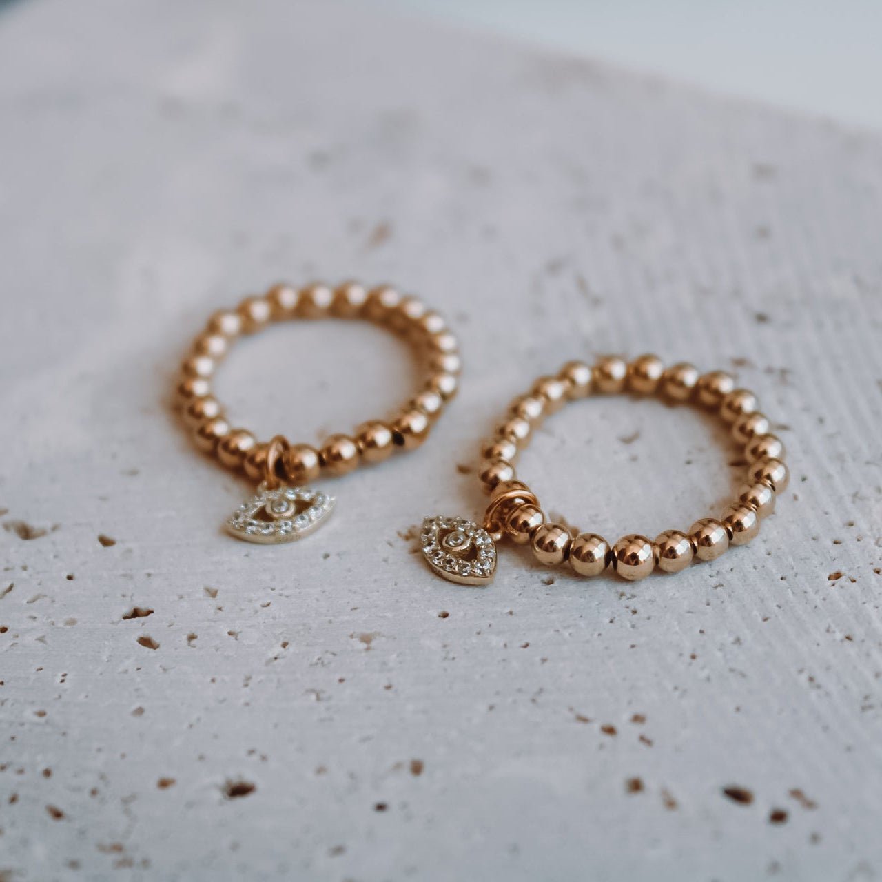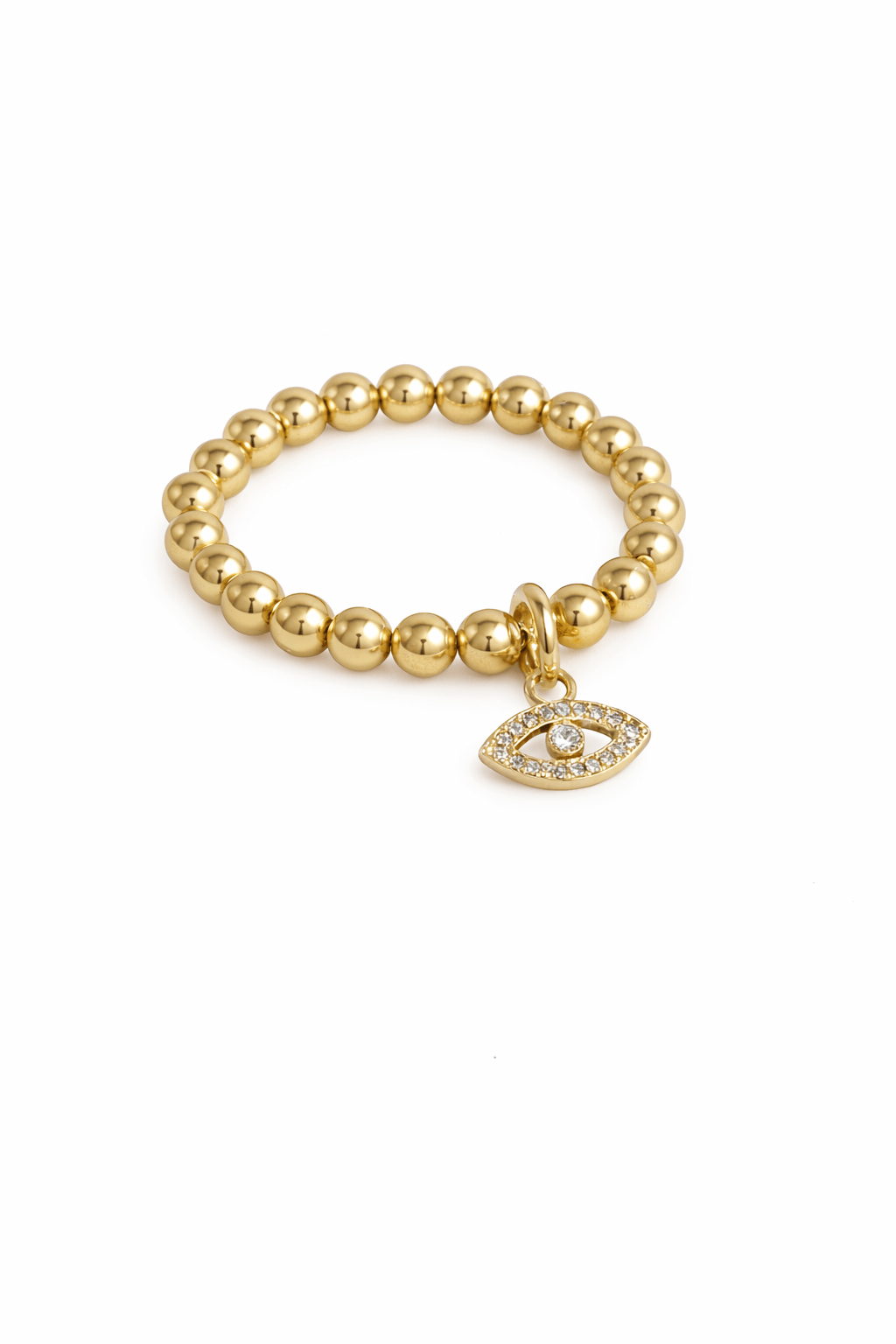 Un amuleto de protección y buena energía. Este anillo combina bolitas huecas de oro 14k elasticadas, que se adaptan cómodamente al dedo, con un dije de ojo protector en plata de ley 925, adornado con microcircones que aportan un brillo delicado.