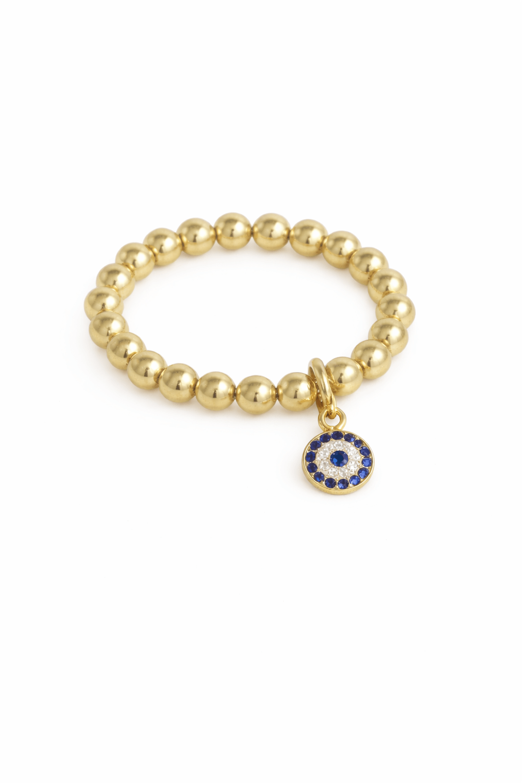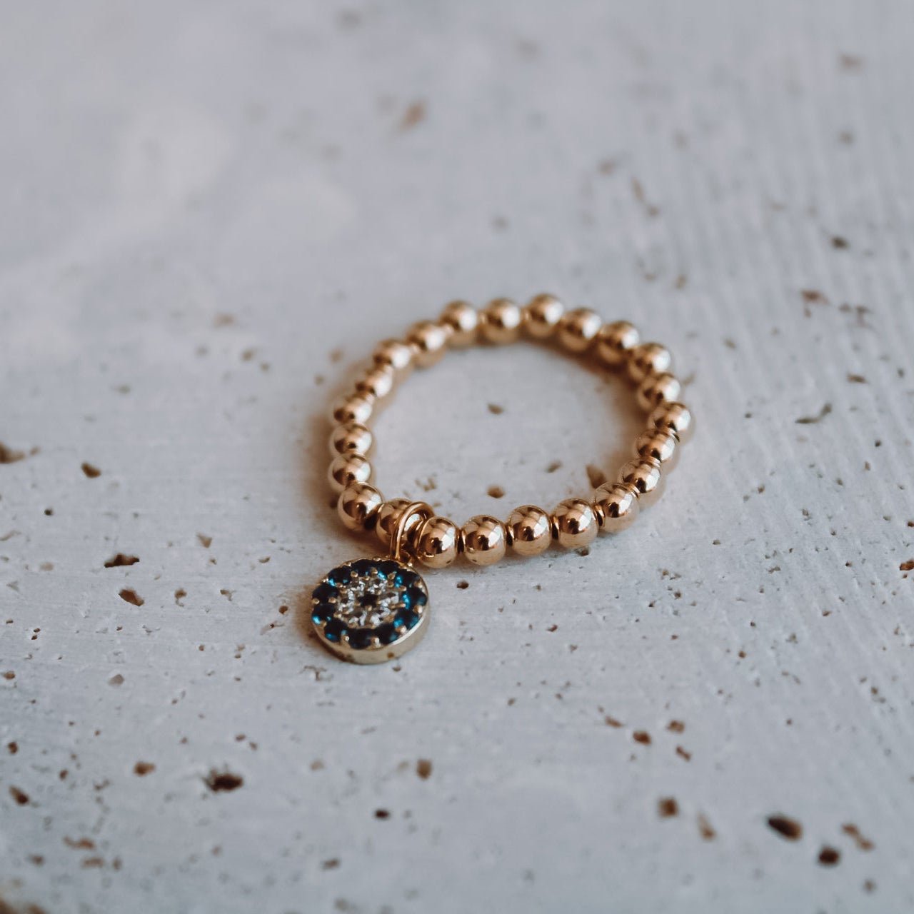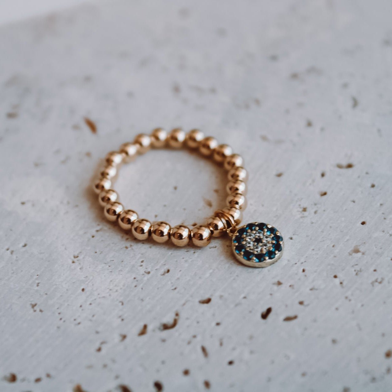 Un amuleto de protección y buena energía. Este anillo combina bolitas huecas de oro 14k elasticadas, que se adaptan cómodamente al dedo, con un dije de ojo turco protector en plata de ley 925, con microcircones que aportan un brillo delicado.
