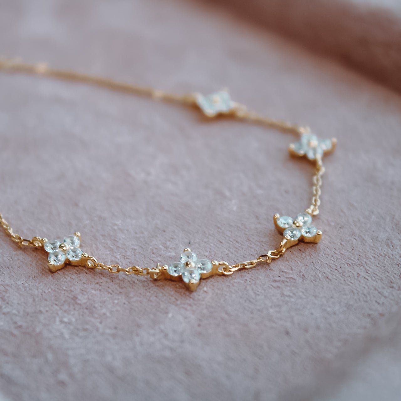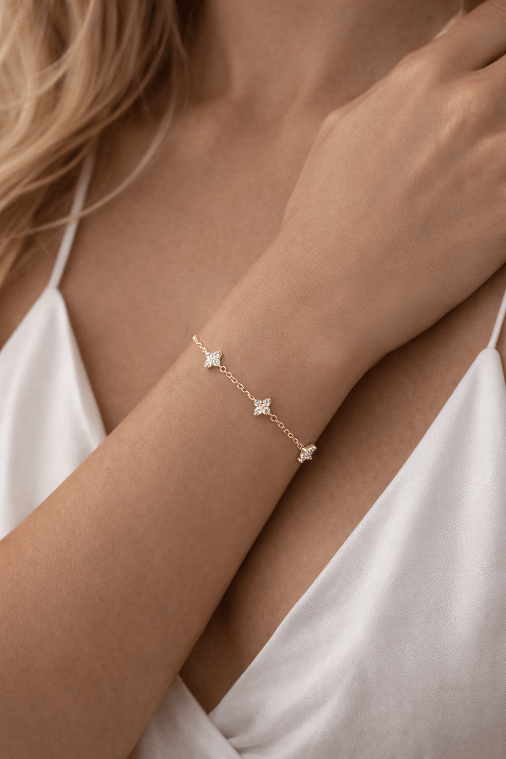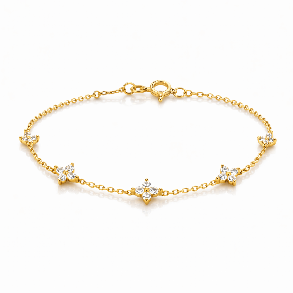 La Pulsera Good Luck está compuesta por pequeñas flores que aportan un brillo sutil y elegante en cada movimiento. Un diseño minimalista que puedes usar todos los días o combinar con otras pulseras para crear un look más protagonista.