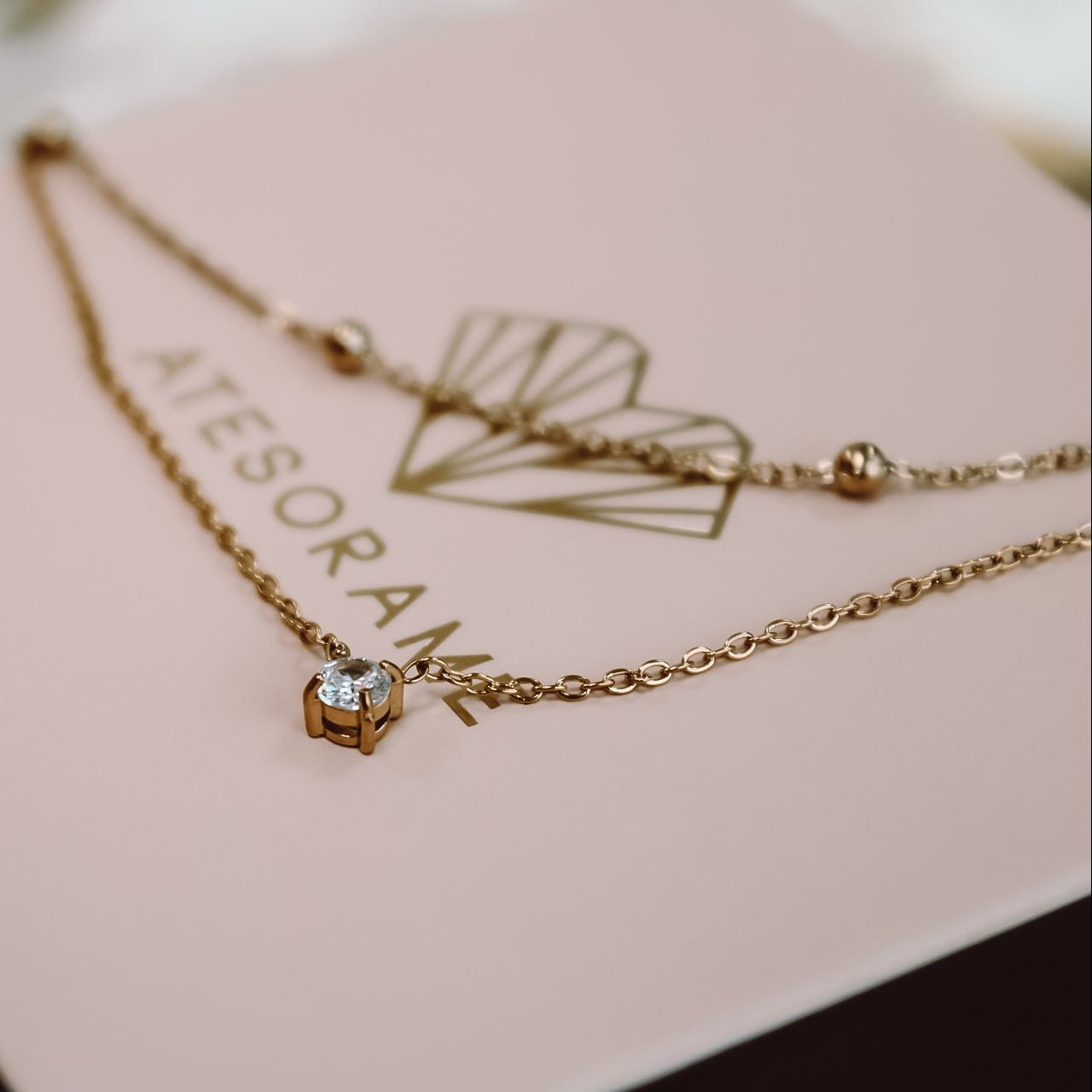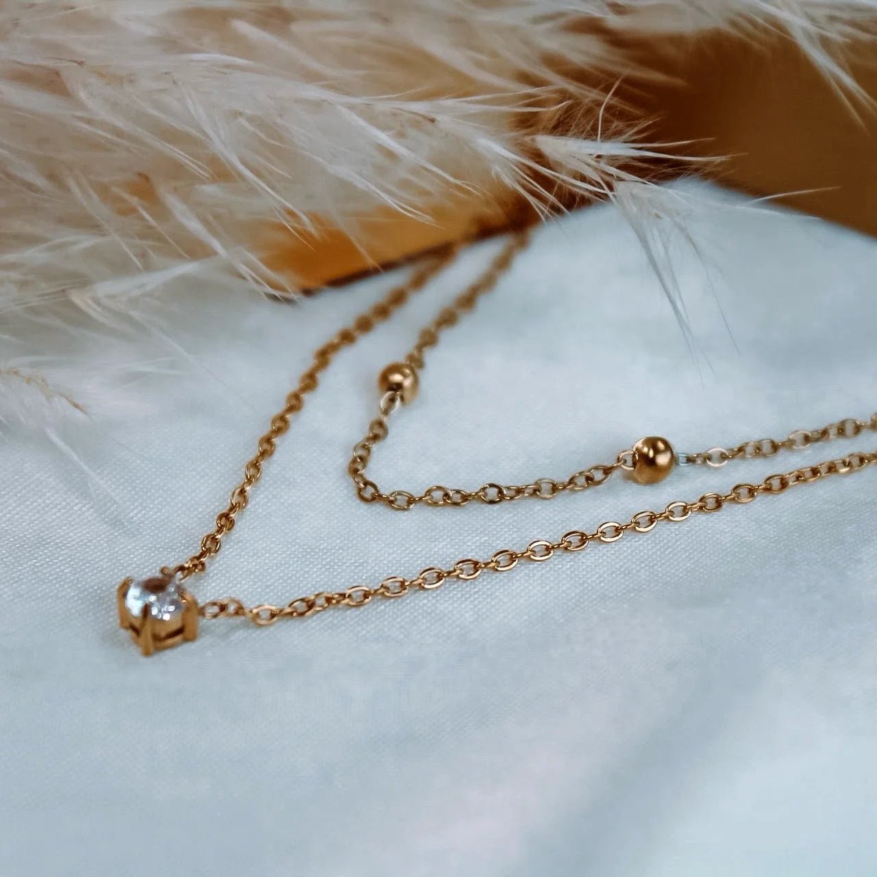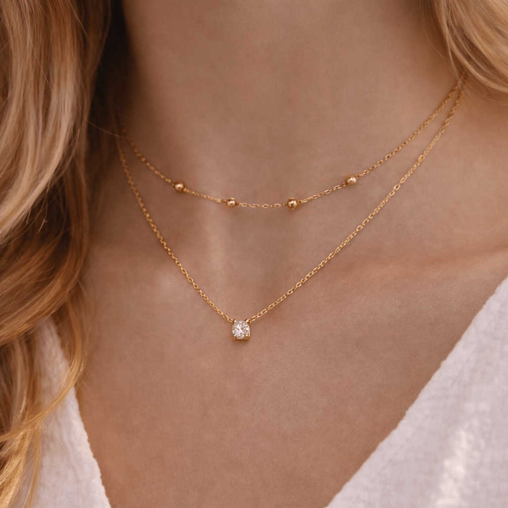 Diseño en dos capas: cadena con bolitas superior y punto de luz largo inferior, creando un efecto delicado y moderno.