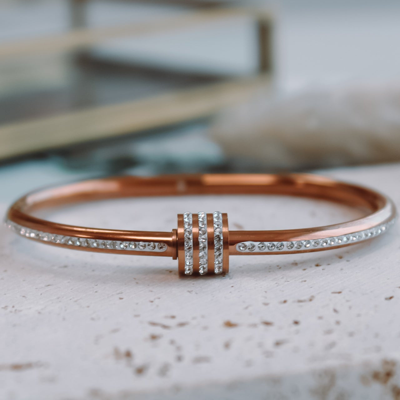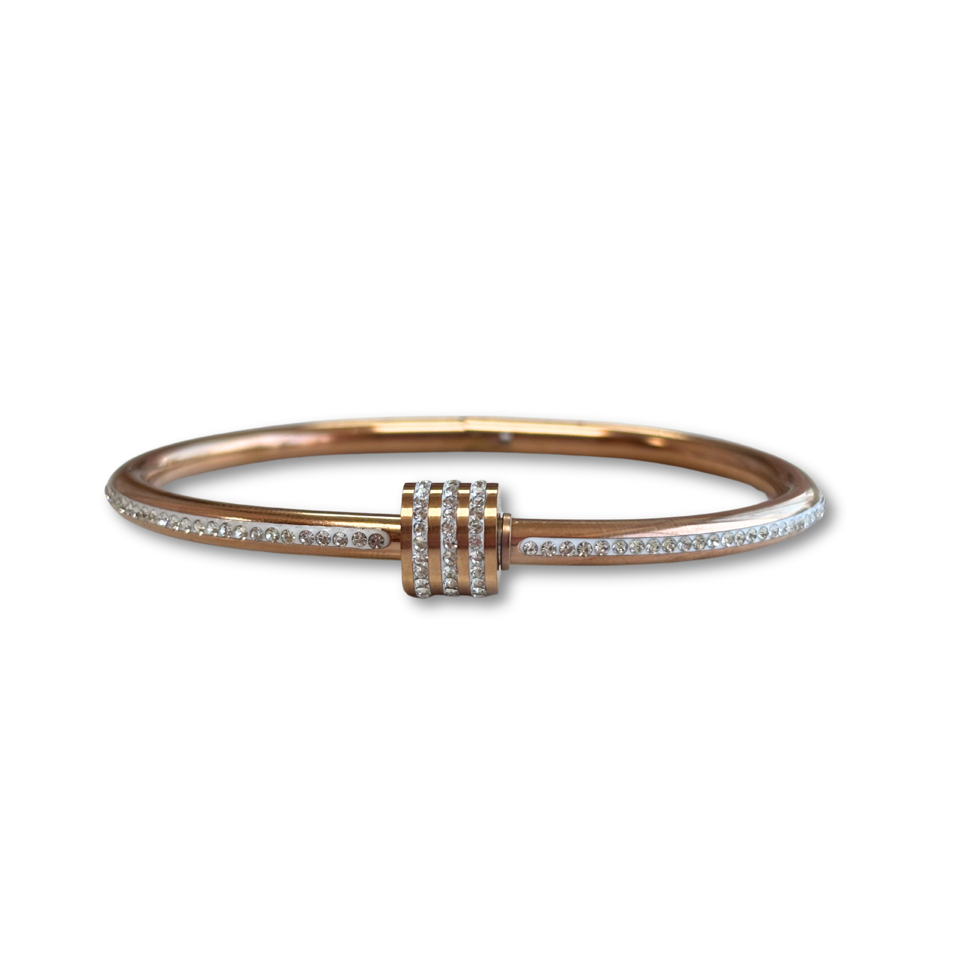 La Esclava Triada Rose Gold combina elegancia y modernidad en una pieza luminosa y sofisticada. Diseñada en acero inoxidable con enchape en oro rosado 18k mediante tecnología PVD, destaca por su detalle central con tres filas de circones, creando un destello refinado que realza cualquier look.