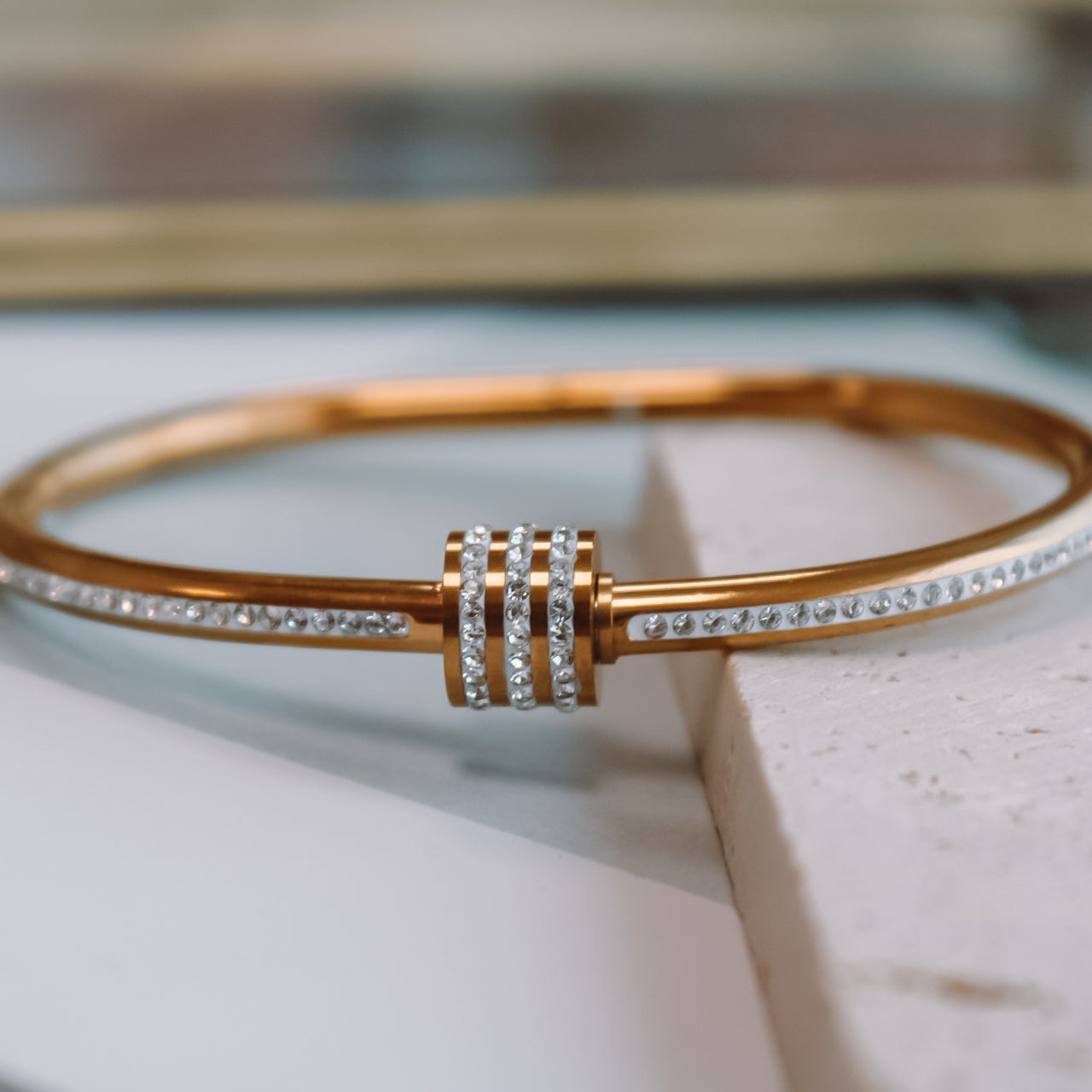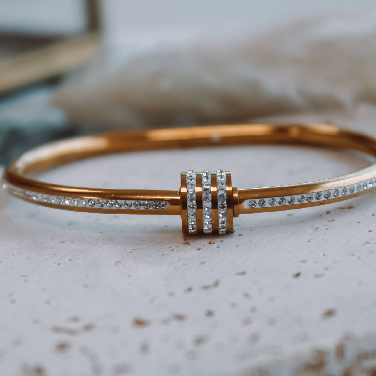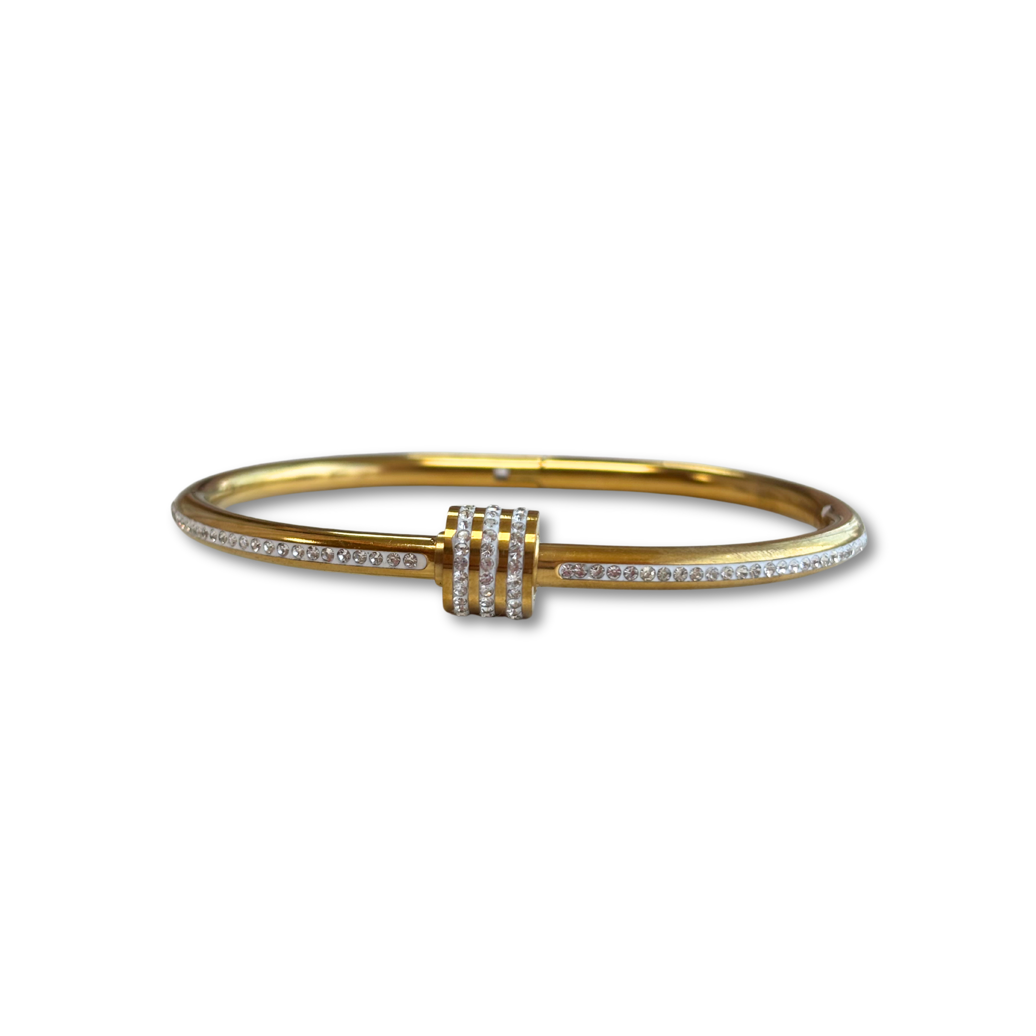 Combina elegancia y modernidad en una pieza llena de luz. Destaca por su detalle central con tres filas de circones, creando un efecto brillante y sofisticado que eleva cualquier look.