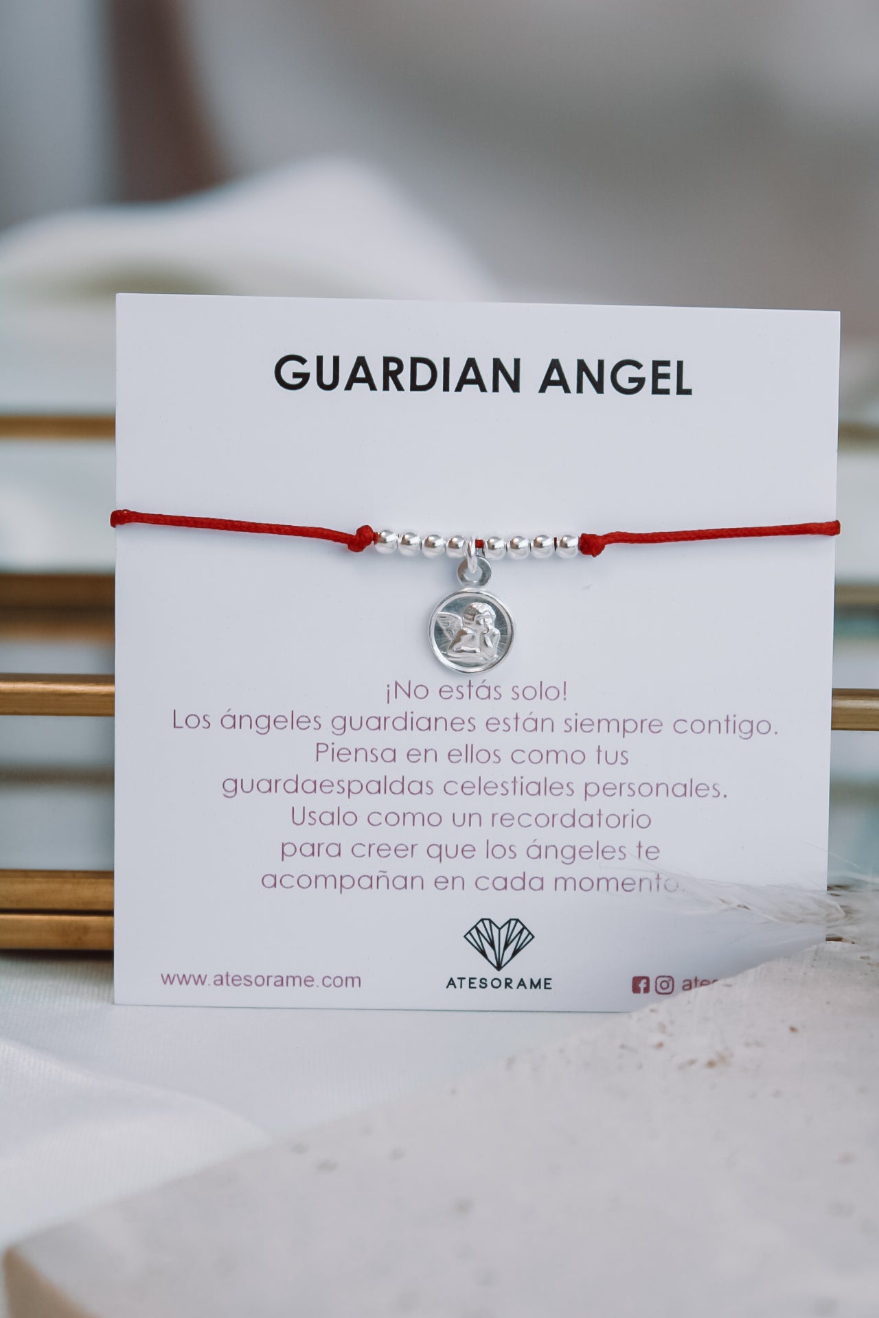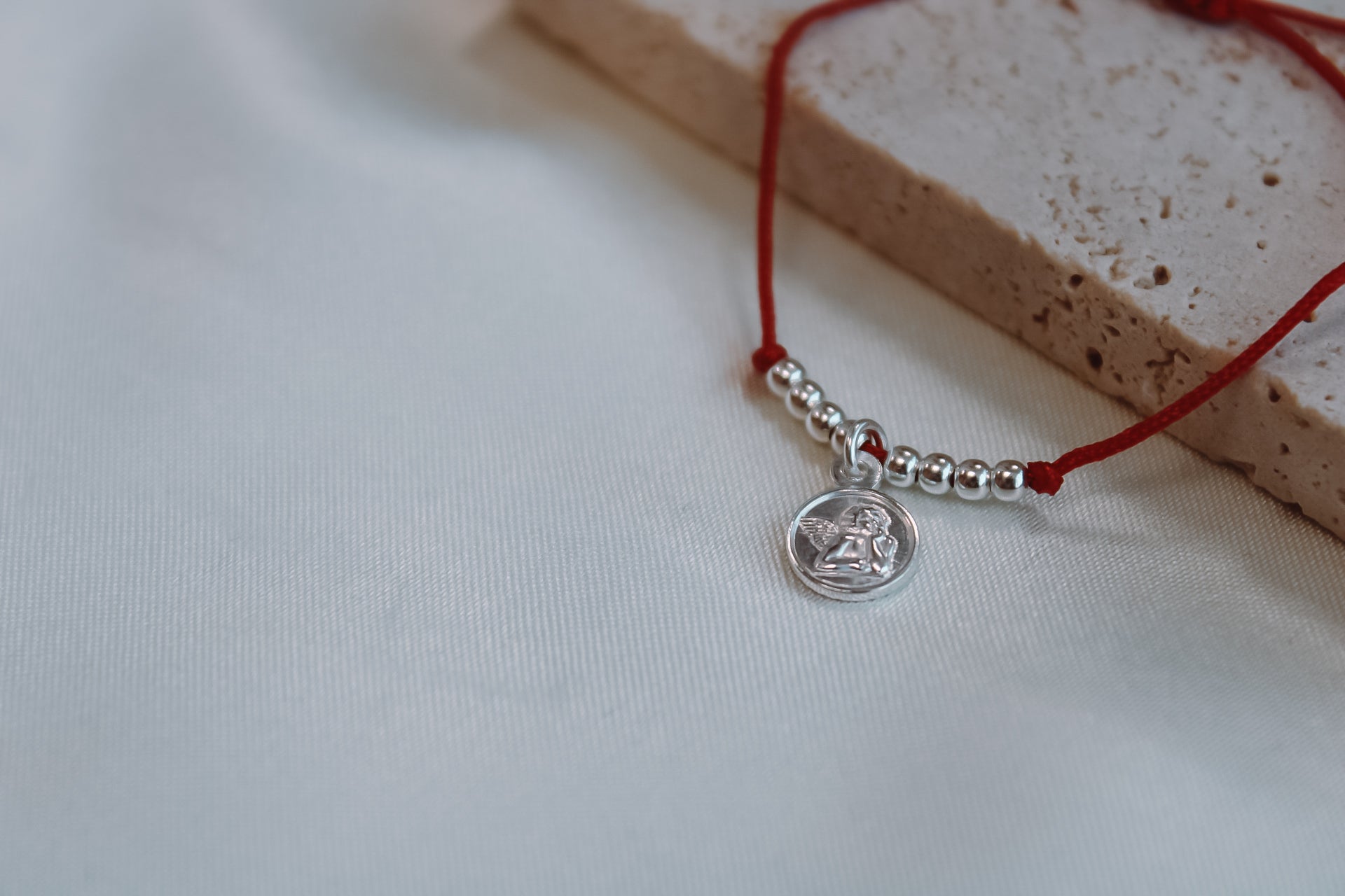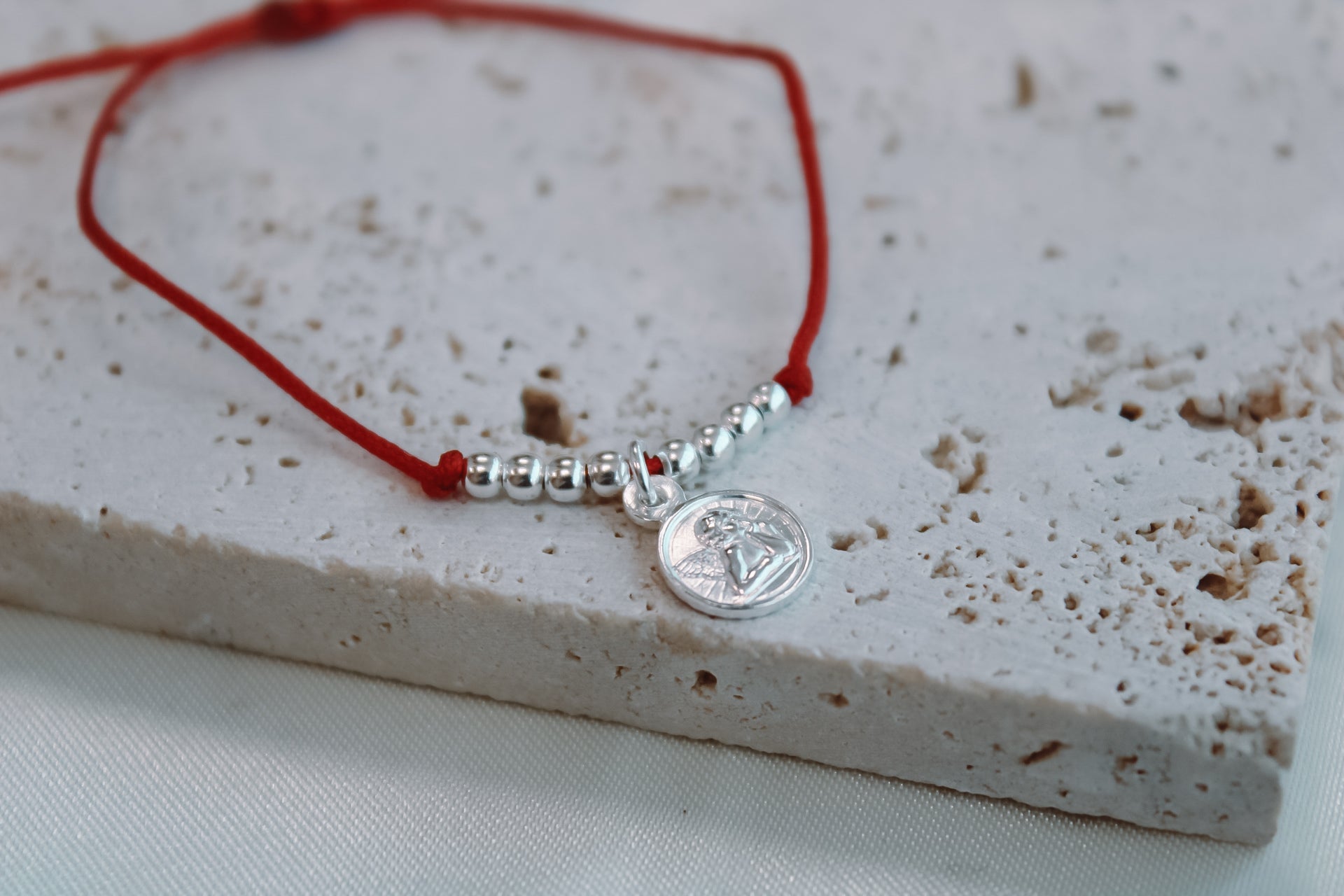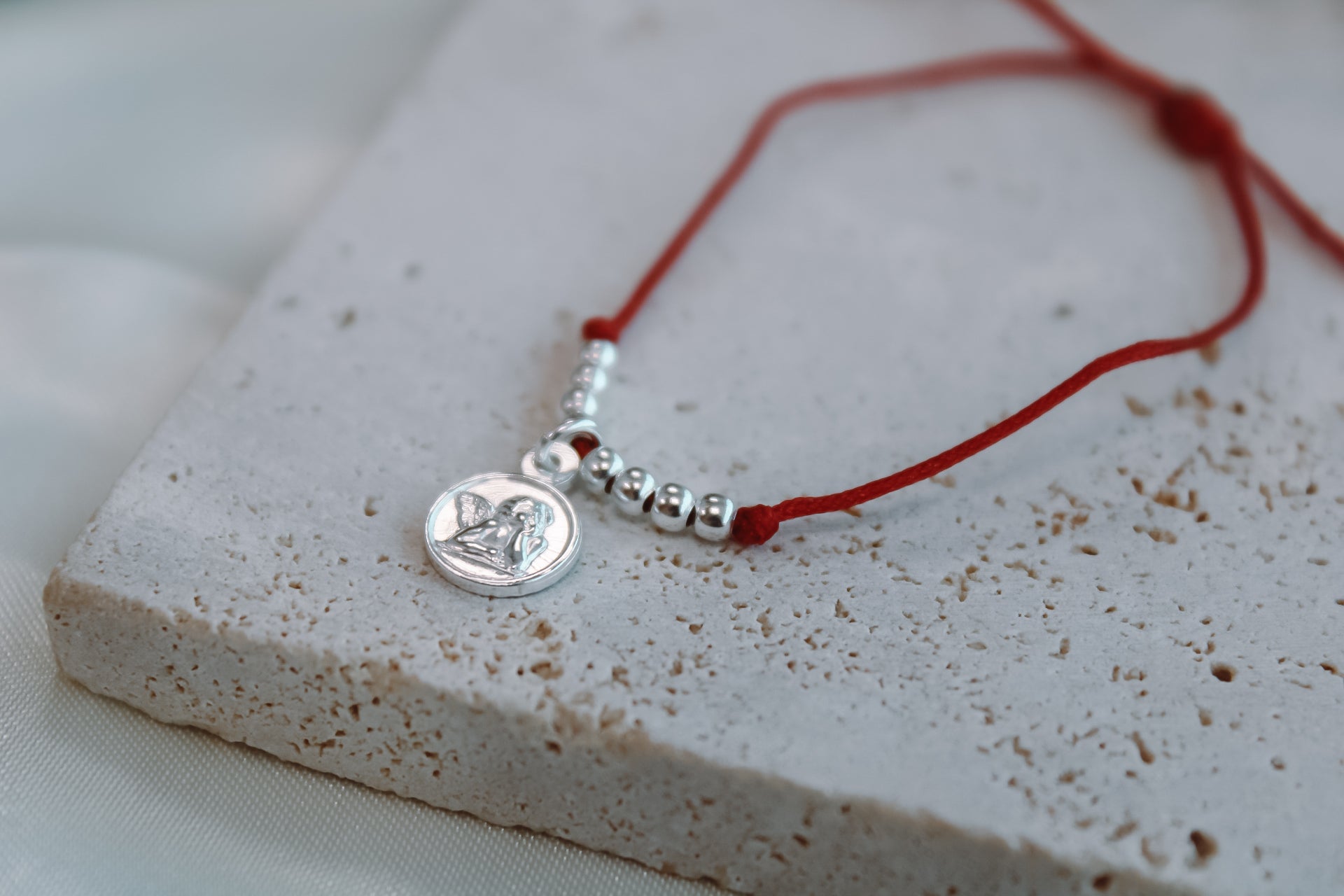 La Pulsera Ángel de la Guarda Petite está diseñada con una medallita de plata de ley 925 y un hilo rojo ajustable, pensada especialmente para niñas. Un amuleto que simboliza cuidado, guía y protección en su día a día.